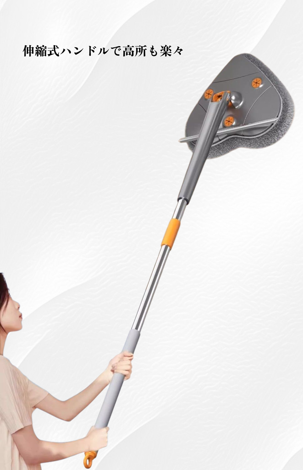 天井掃除や壁掃除に最適な多機能モップ。伸縮式で高所も簡単清掃。取り外し可能なヘッドでお手入れ簡単。